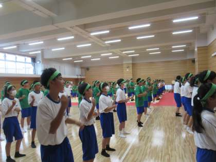 グラウンドはまだ少し水たまりが残っているため、1時間目は団活動を室内で行いました。