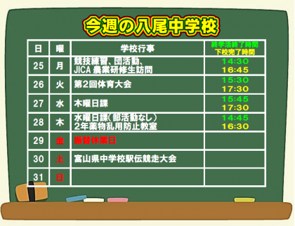 週末には富山県中学校駅伝競走大会が行われます。夏休み中から練習してきた選手に声援を送りみんなで応援しましょう。