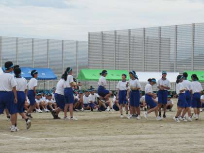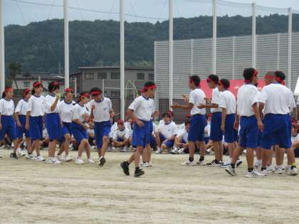 八尾の「八」、八の字縄跳びの「八」で、八尾中にぴったりの競技です。小学校の頃から跳び慣れているため、全員ビュンビュン跳んでいきます。各団1〜3年生の混合4チームで行います。