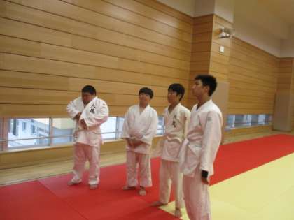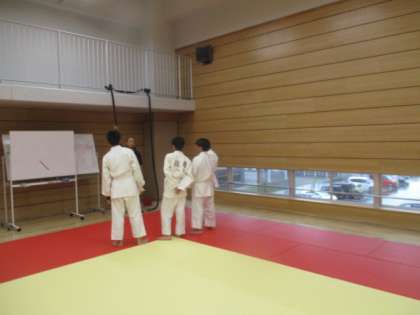 柔道部は、練習前のミーティングをしています。真剣な眼差しで、顧問の先生の話を聴いています。