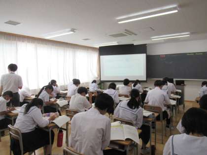 写真下は、英語の授業の様子です。「〜している〜」という後置修飾の学習をしています。