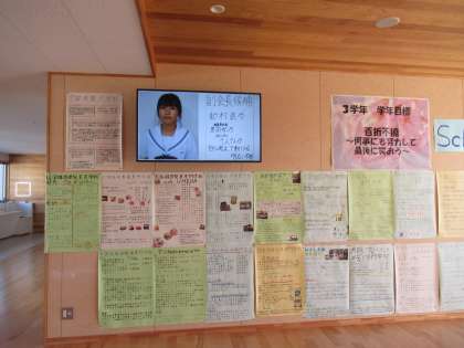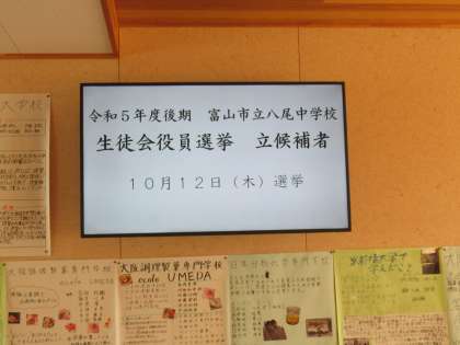 各学年フロアや生徒玄関前のサイネージにエンドレスで流れています。よく見て、公約をよく読んで選挙に臨みましょう。