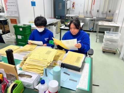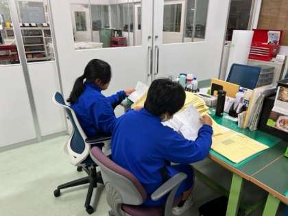書類の点検作業をしています。製品番号が正しいかなど、二重チェックをしています。