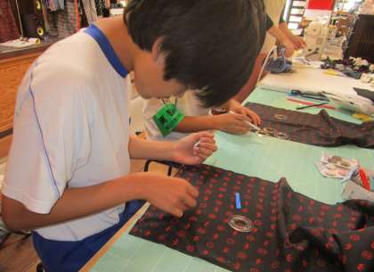 指導者の方のご指導のもと、着物を丁寧に解体したり型どりをしたりしています。とてもおしゃれで魅力あふれる店内で楽しく仕事に取り組んでいます。