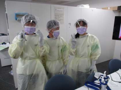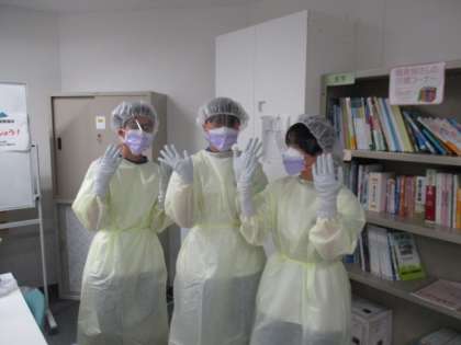 感染症対策の防護服を着ています。病院内を回るときも感染症対策をしっかりとしています。