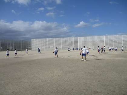 男女混合のペアで、仲良くキャッチボールをしています。強肩の男子も、女子には力を抜いて投げています。優しいですね。