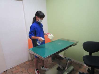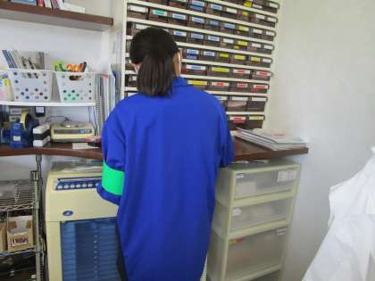 丁寧なご指導のもと、気を付けながら薬の仕分けをしています。診察を見学させていただいた後、診察台の清掃をしました。