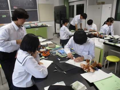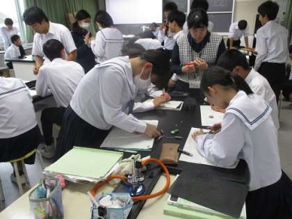 物体に角度をもってはたらく力を、ばねを使って記録し、力の関係を調べています。