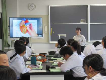 写真下は、2年生の理科の授業の様子です。心臓の働きについて学習しています。