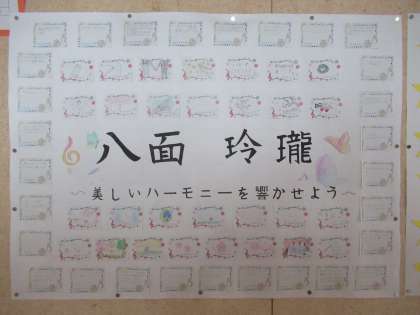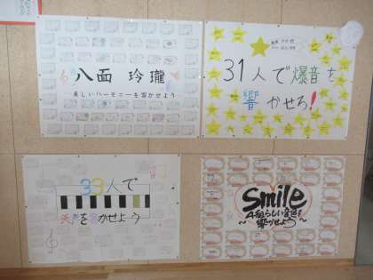合唱コンクールに向けた学級目標と一人一人の意気込みが掲示してあります。