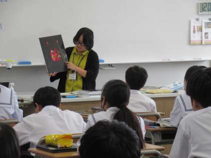 お面作りの学習の前に、どんなお面があるかについて学習しています。