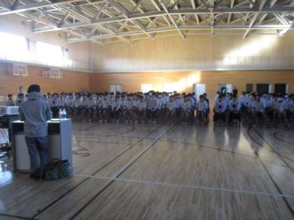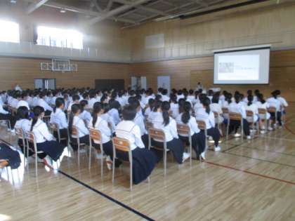 部活動カウンセラーの先生が運動部の生徒を中心に、中学生期の栄養指導をしてくださいました。身体の成長にはタンパク質や脂質の摂取が重要だということを教えていただきました。