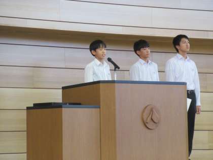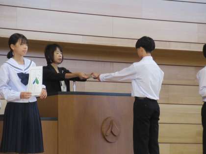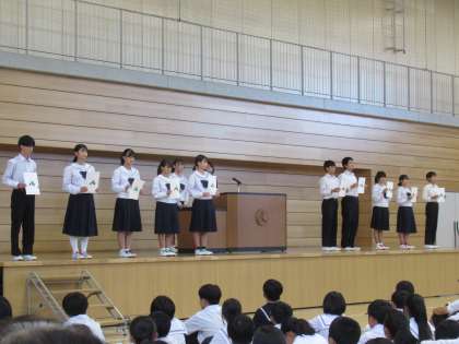まずは、後期役員が校長先生から任命書を受け取り、後期生徒会長が意気込みを述べました。
