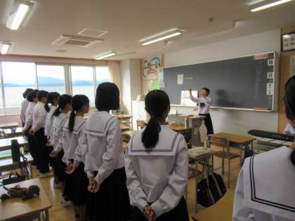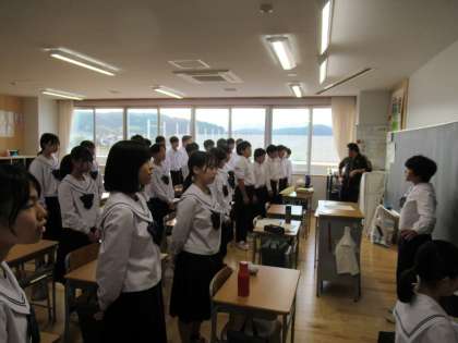 写真中・下は、2年生の朝の会の様子です。1・2限目がリハーサルとあって、声出しを兼ねて歌っています。