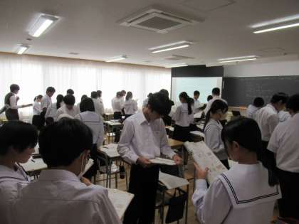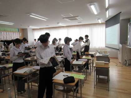 写真上・中は、英語の授業の様子です。音読練習をしています。個人の後は、ペアで練習しています。