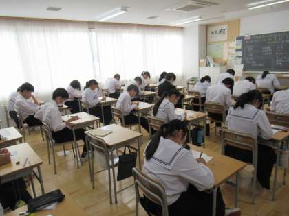 写真下は、数学の授業の様子です。単元テストに挑戦中です。