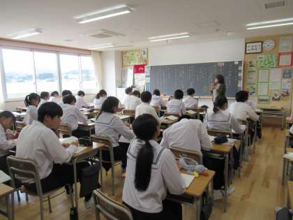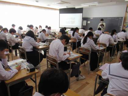 写真中は、英語の授業の様子です。真剣にリスニングに取り組んでいます。