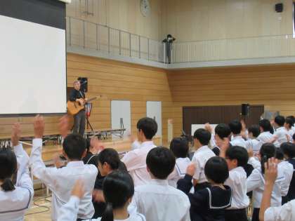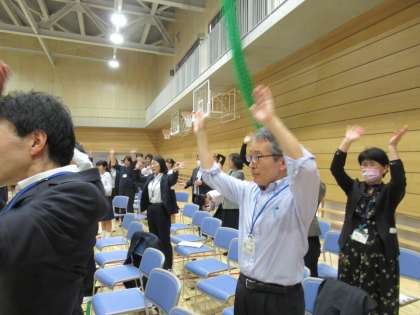 全員立って、ジェスチャーをしながらノリノリです。先生方も一緒にノリノリです。