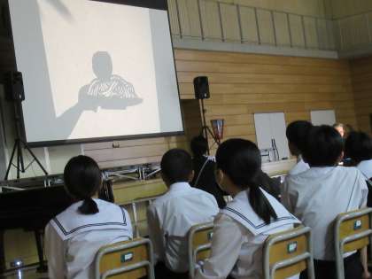 日本では、転がっていくのは「おむすび」ですが、アメリカではスパゲティの上に乗った「ミートボール」。お話はもちろんのこと、それを影絵で巧みに表現されていました。