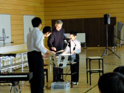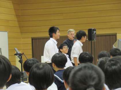 体験コーナーがあり、やってみたいと挙手する生徒が前へ出て実際に影絵を動かしてみました。