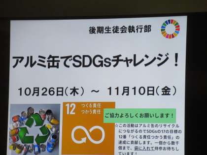 今日から、後期生徒会長が公約に掲げた「SDGsプロジェクト」として、アルミ缶の回収をスタートしました。回収かごを駐輪場から生徒玄関前に移動させ、まずは、この2つのかごをアルミ缶でいっぱいにすることを目標とします。