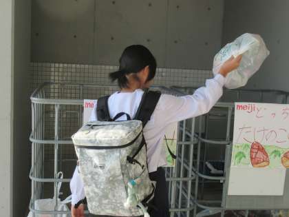 昨日からスタートしたアルミ缶回収プロジェクト。初日の回収が少なかったため、すぐに改善して実行!改善案は、「きのこの山」と「たけのこの里」の好きな方にアルミ缶を入れることができるというものです。