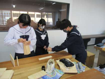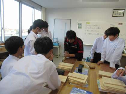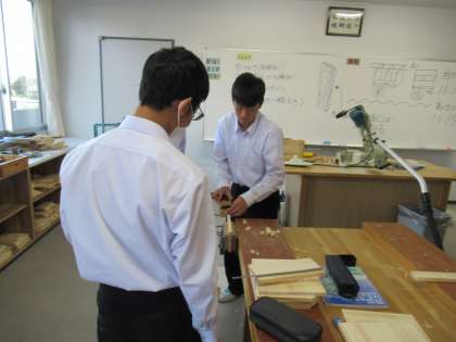 写真は、かんな削りの仕方を聴き、実際に万力に挟んで削っている生徒の様子です。