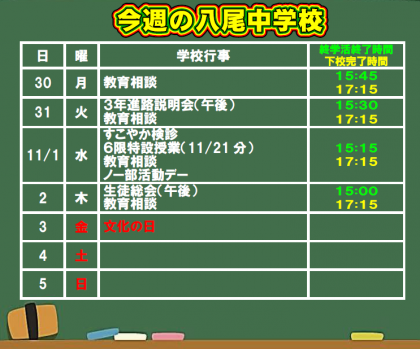 今週は31日(火)に、3年生徒と保護者を対象にした進路説明会があります。会場は体育館です。3年保護者の皆様には、ご多用のところ恐縮ですが、参加くださいますようよろしくお願いします。