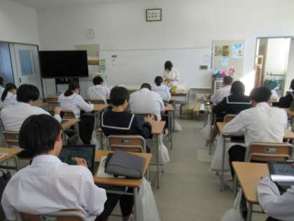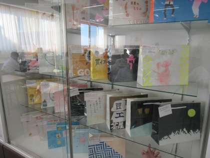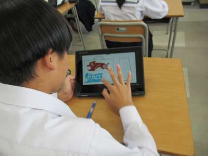 昨年度の先輩の作品を参考にしながら、今年も郷土のよさをアピールするためのペーパーバッグづくりをしています。下絵を完成させることが本時の目標です。chromebookの機能を活用し、パソコン上で下絵を作成しています。