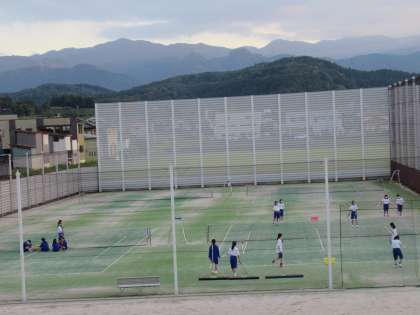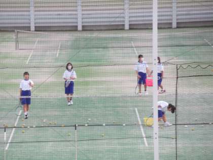 ソフトテニス部は、広いコートで練習に励んでいます。