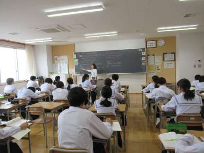 写真上は、数学の授業の様子です。比例と反比例の学習です。Xの変域の表し方を学んでいます。