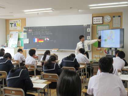 写真下は、社会の授業の様子です。EUについて学習しています。
