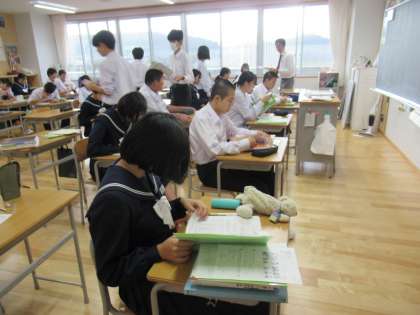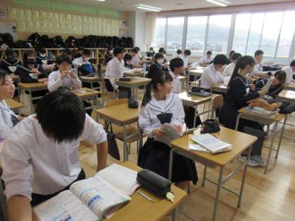中教研学力調査1日目の朝の様子です。朝から教科書やノートを見返しています。