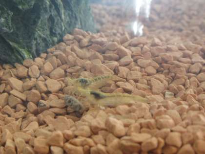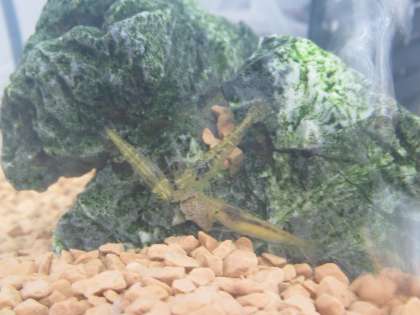 3匹のエビが岩のところに集まっています。3人寄れば文殊の知恵ならぬ、3匹寄れば文殊の知恵?
