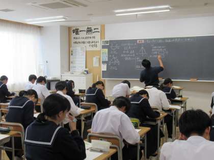 写真下は、数学の授業の様子です。二等辺三角形の頂角の二等分線の性質の証明について学習しています。