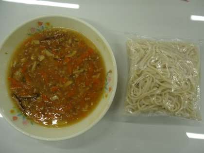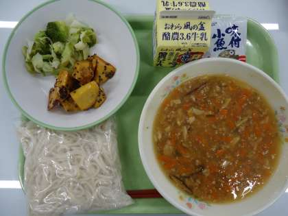 ソフトめんは正式には、「ソフトスパゲッティ式めん」といい、めんを一度蒸して、その後にゆでて作られます。そのため、必要以上に水分を吸収しないので、最後まで伸びずにおいしくいただけます。ソフトめんは給食専用に考えられためんです。今日は肉みそと一緒に美味しくいただきましょう。