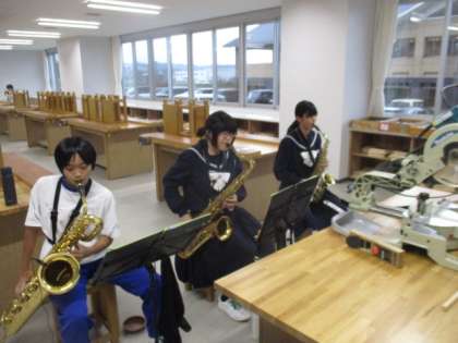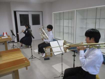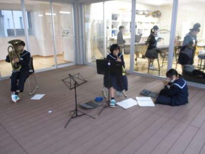 吹奏楽部の様子です。パート別に教え合いながら練習しています。