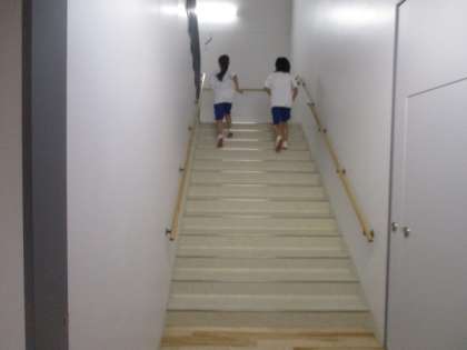 陸上競技部の様子です。外は雨が降っているので、室内で階段を利用したトレーニングを実施しています。