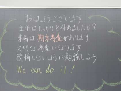今日から、2学期末考査に向けて部活動停止期間となります。放課後の時間を有効に使い、学んだことを総復習しましょう。