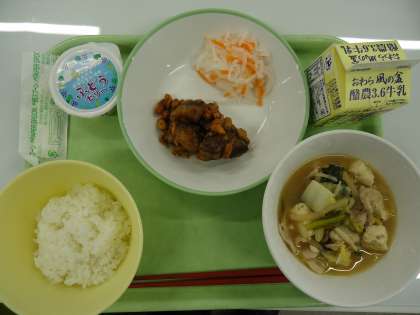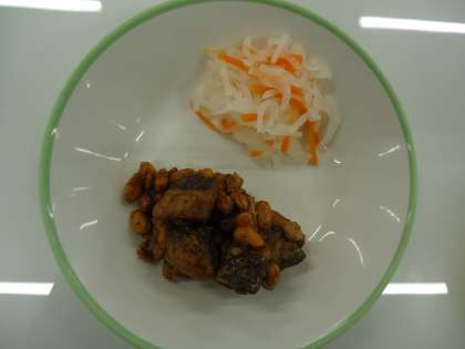 「魚と大豆のえごまからめ」に使われているフクラギは、ブリになる前の魚で、体長は30〜4センチメートルほどです。ブリに比べて脂が少なく、さっぱりと食べることができます。漢字では「福が来る魚」と書き、富山で親しまれている魚です。富山県の食材を味わっていただきましょう。