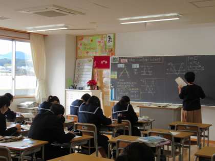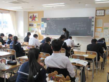 写真上は、数学の授業の様子です。三角形の比の定理を学習しています。