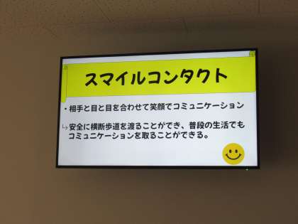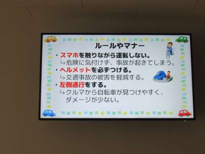 先日、実施した「自転車教室」での学びも、生活安全委員会がまとめを作成し、サイネージで放映しています。