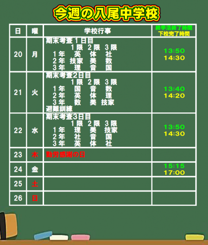今週はいよいよ期末考査があります。体調管理には十分に気を付けてください。