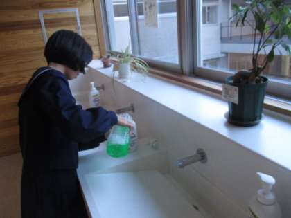 保健委員会の仕事の様子です。毎日全員が使用するハンドソープの補充を行っています。校内の全ての箇所を確認し、補充をしています。健康を保つために、保健委員会が中心となり頑張っています。