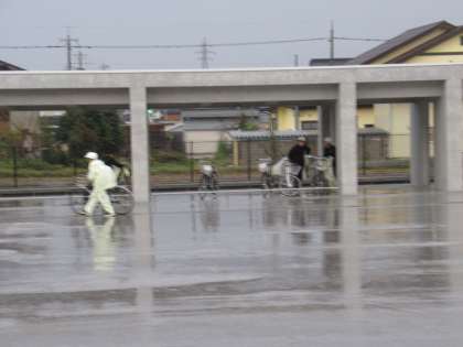 雨の中、自転車通学した生徒は、駐輪場から生徒玄関前まで雨に濡れないように、ヘルメット、かっぱを着用したまま生徒玄関まで来るように指導しています。
