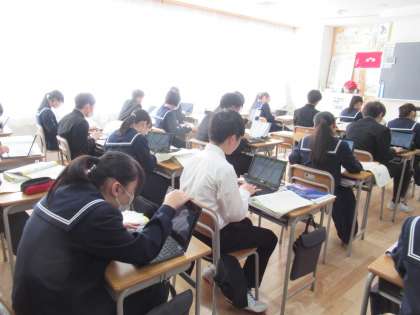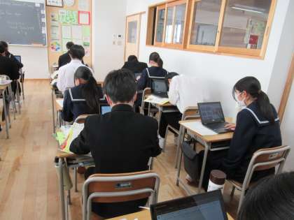 写真上・中は、英語の授業の様子です。これまで学習した表現をフル活用しながら、日本文化を紹介する英文を作成中です。chromebookが大活躍しています。