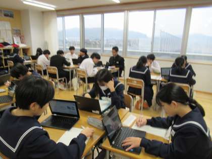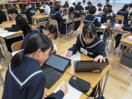 写真上・中は、英語の授業の様子です。来週2回目のマレーシアの中学校との交流授業を行います。それに向けて、伝えること、伝えたいことをまとめています。14歳の挑戦について英語で紹介します。