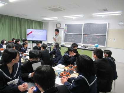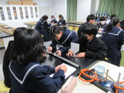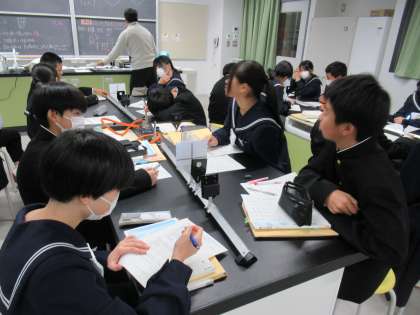 凸レンズに光を当てる実験をしています。