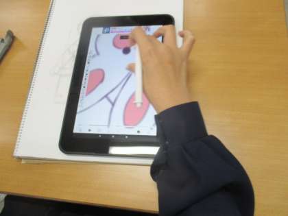 美術部の様子です。デザイン画を基に色付けを開始します。コンピュータでも色付けをします。