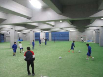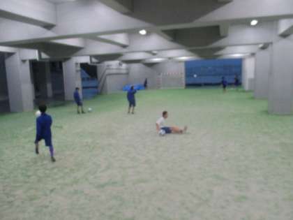 サッカー部はピロティを利用し活動しています。雨の中でも元気に動いています。
